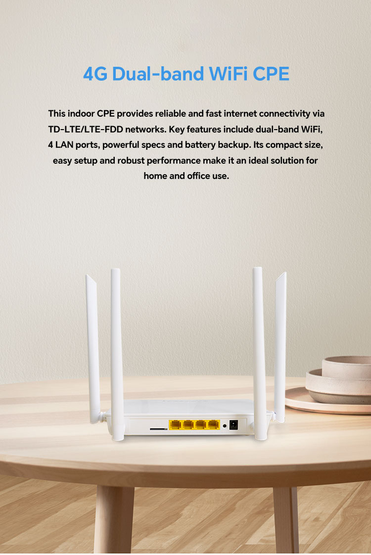 This indoor CPE provides reliable and fast internet connectivity via TD-LTE/LTE-FDD networks. Key features include dual-band WiFi, 4 LAN ports, powerful specs and battery backup. Its compact size, easy setup and robust performance make it an ideal solution for home and office use.
