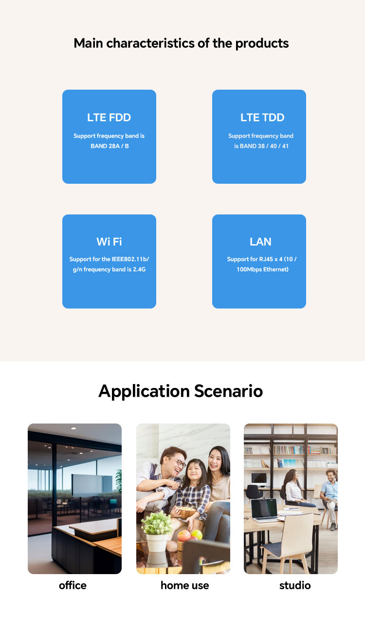 | Band | FDD B1/3/5/8 TDD B38/40/41 |